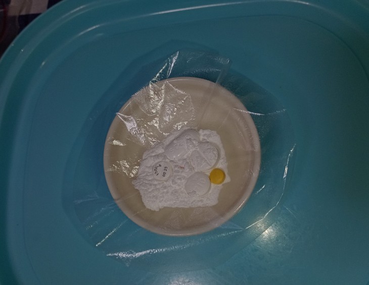 【手順2】オブラートに十字の折り目をつけて小皿に乗せておく ↓